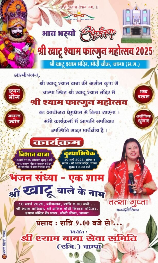 तो वही आज शाम को भजन संध्या एक शाम श्री खाटू वाले के नाम का आयोजन समिति द्वारा किया गया है जिसमें देश की सुप्रसिद्ध भजन गायिका रांची की बिटिया तत्सा गुप्ता द्वारा श्याम महिमा का बखान अपनी सुमधुर वाणी से करेंगी यह कार्यक्रम श्याम मंदिर के पास श्री श्याम वाटिका, अनिल मोदी के निवास परिसर में रति 8 बजे से आयोजित किया गया है।